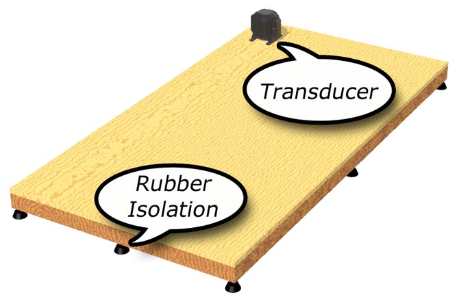 A typical Transducer sub-floor installation. Transducer is mounted on top of the floor and rubber feet are used for isolation.