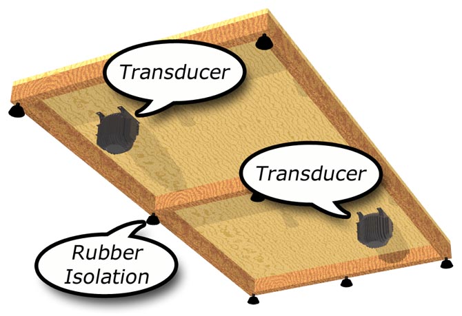 A typical two Transducer sub-floor installation. Transducers are mounted on top of the floor and rubber feet are used for isolation.