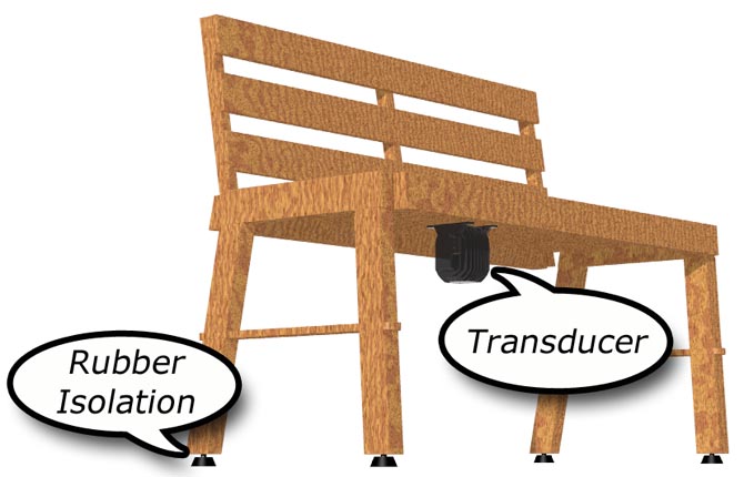 The FrightProps Transducers can be bolted on top of or underneath flooring, benches, walls, etc. Whatever they are attached to should have some form of rubber isolation, such as rubber feet, rubber air bags, rubber tires, etc. This will allow the vibration to be felt to its maximum potential. If there is no rubber isolation then the vibration will be absorbed into the underlying floor and not felt like it should be.