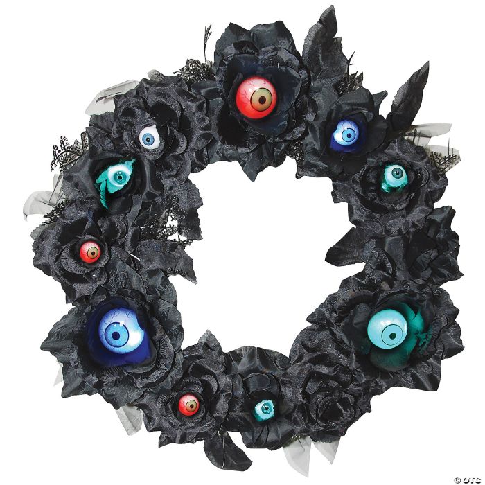 A great decoration to let the trick or treaters know you are celebrating halloween this year! This wreath with light up eyeballs is sure to draw them in even as the hairs on the backs of their necks start to stand up! 15 inches. Batteries included.