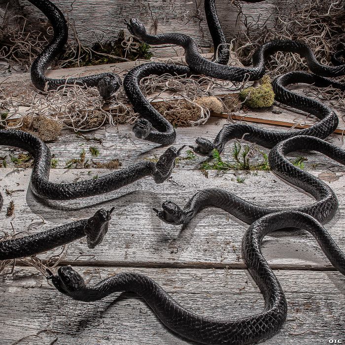 Must-have accessory for any haunted setting! Our Bag contains 6 black snakes, each one a 16" undulating, open-mouthed black slithery reptile. Scatter them about your setting or have them all appearing to come out of a vase or through the eyes of a sk