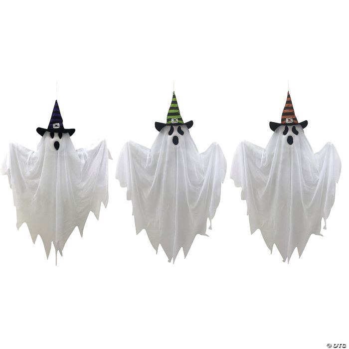 Witch Hat and Ghost Set Of 3. A great Halloween decoration for your classroom or office! Includes: Set of three hanging ghosts with different colored, striped witch hats. Each ghost measures 28" tall.Material: PLASTIC