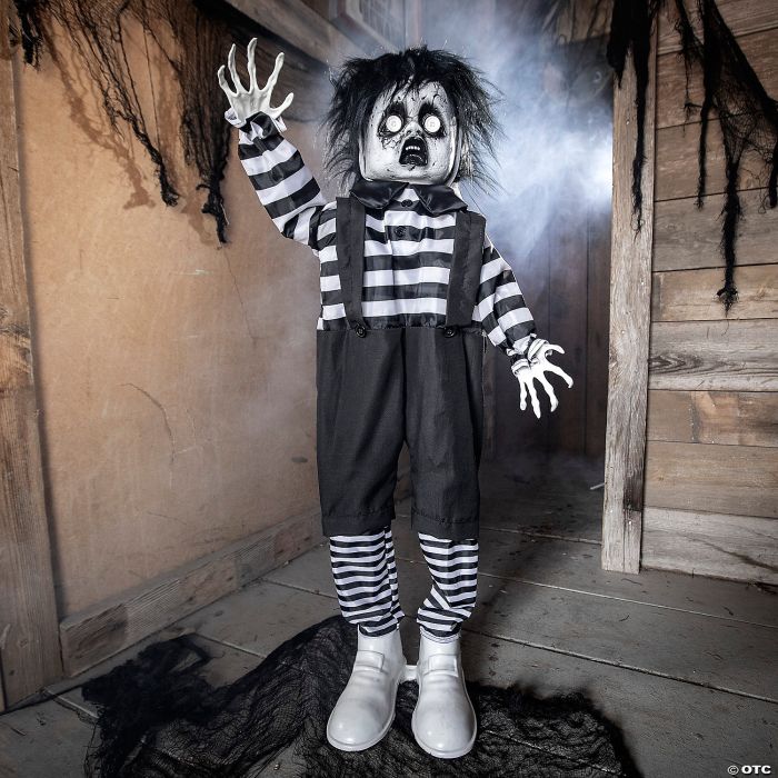 This little boy wants to play but his looks will scare people away! This standing Halloween decoration features a boy dressed in black and white clothes with a black and white face, black hair and large shoes. His open-mouthed expression makes him look surprised, but this animated decoration has a surprise for passersby. He will startle them by creepily laughing and playing a music box as well as speaking the following phrases: “Do you wanna play? Come closer. I’ve got a secret.” Batteries required.