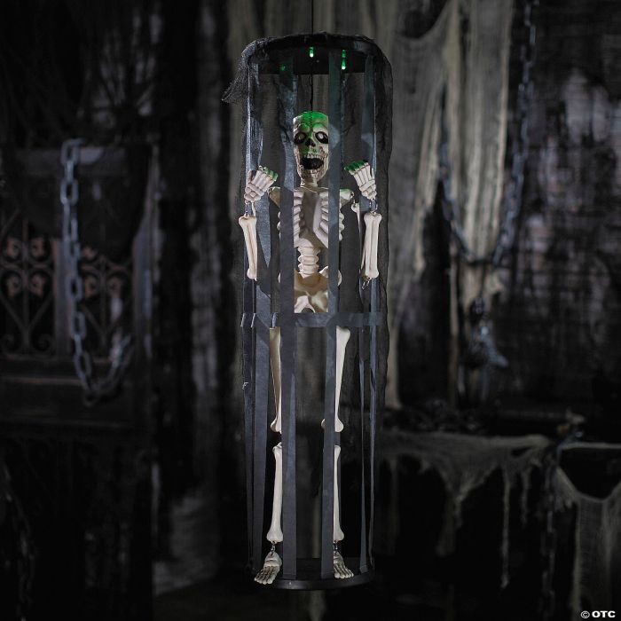 This sound-activated skeleton is shaking the cage to get free and is a great addition to Halloween displays for a haunted house or party decoration.