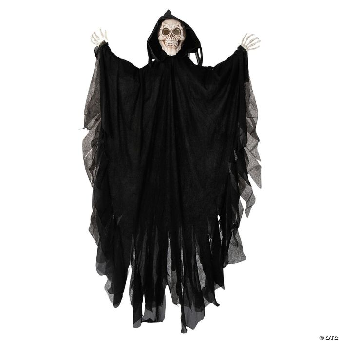 Thrillingly great for a haunted house display or Halloween party decorations, this animated hanging reaper features skeleton face and hands and ragged, black, hooded cloak.