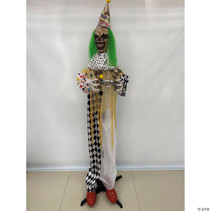 This eye-catching Halloween decoration is a real head turner! The clown’s outfit features a colorful polka dot pattern, checkerboard pattern, stars on a white background, a striped, multicolor hat and bright red shoes. This combination of designs will seem disturbing to passersby or guests to your Halloween party until they get a look at the clown’s dark and scary skeletal face with its maniacal grin. To add to the eerie chill, this clown turns its head, as well. This ghoulish clown is the perfect addition to a haunted carnival or any fright night front porch display. Batteries required.