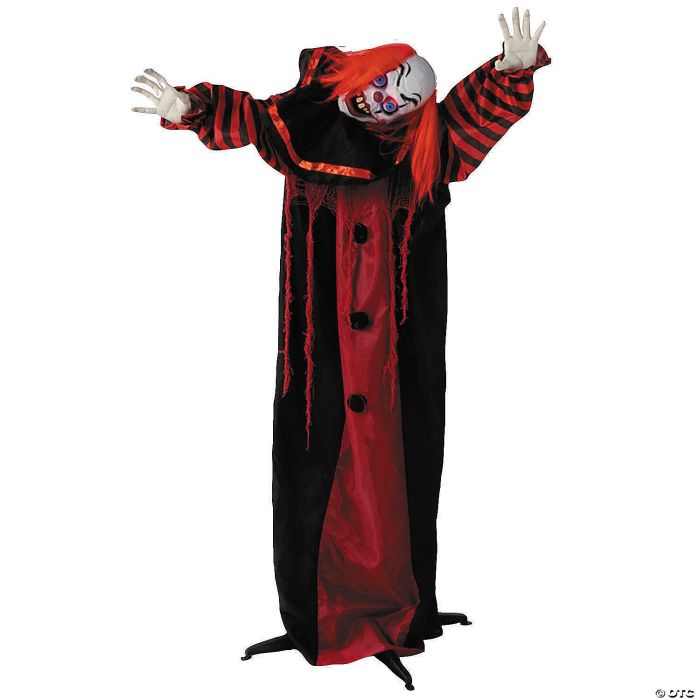 Raise the spook level for a haunted house display or Halloween party decorations with this animated standing clown that features red hair, bright blue eyes and a black and red clown suit.