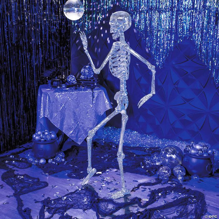 Bring on the sparkle in a haunted house setup, photo booth display or entryway decorations with this posable, disco skeleton.