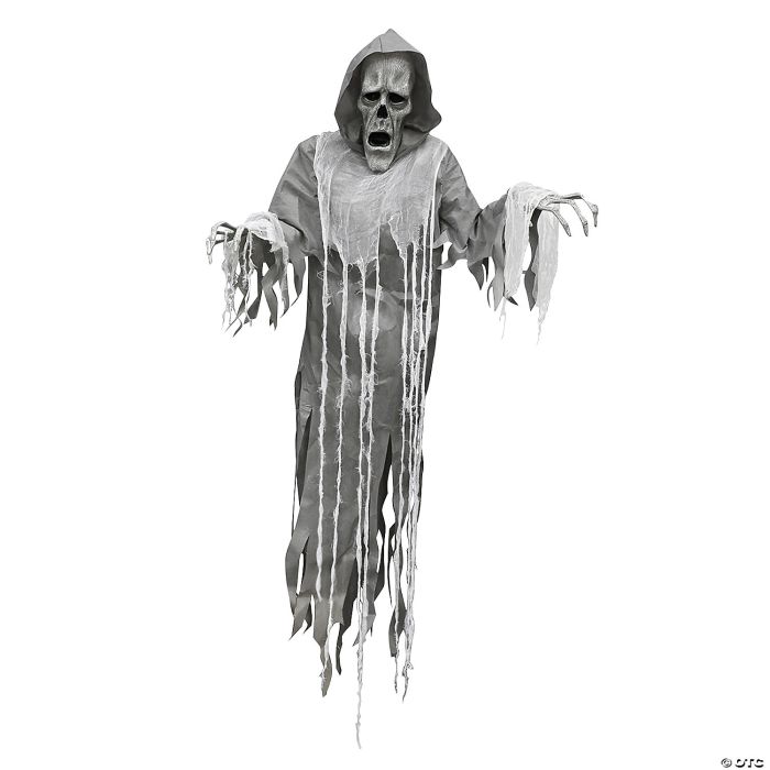 This 72-inch Hanging Reaper life-sized prop has blow-molded elongated head and hands with poseable arms light-up eyes and a tattered costume with hood and gauze details. There is a motion-sensor activation for the sounds he speaks and there is a volume control. He makes creepy moaning sounds! Just the scary prop you need for your Halloween setting! Takes 3 AA batteries which are included. Made of plastic metal, and cloth.