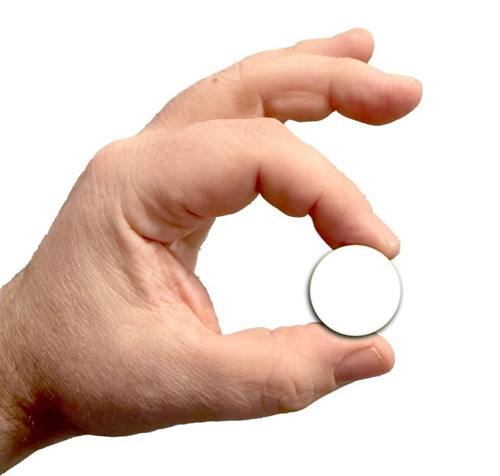 The discs are 1" across and 1/16" thick. back is adhesive so the chips and be stuck to props or other objects,