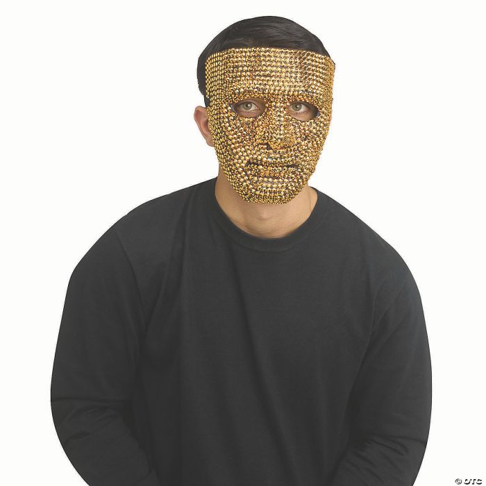 Add some flash and sparkle, and a little air of mystery, to your next Halloween costume with our Gold Bling Blank Mask! Individual faceted stones cover the face mask in glittering gold. Add your own black hooded robe for a dramatic look. Elastic headband for a comfortable fit. One size fits most adults.