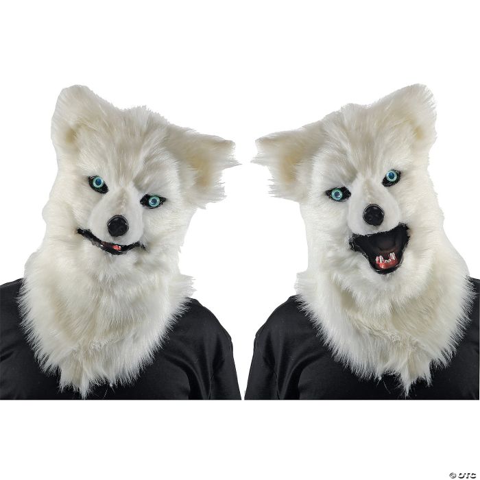 Legends come to life with this illusive white wolf animated mask with sound effects! The mouth moves when you move your mouth creating the illusion of a real wolf! White wolf mask is made from molded plastic and covered in plush white fur with intense light blue eyes., This Halloween mask is lightweight, comfortable and easy to wear. Adjustable foam inserts enable a snug fit at the jaw for realistic movement. Comes with push-button activated loud snarling, growling, and howling sounds that you operate by a push button device you hold in your hand (a cord runs down your sleeve). Creates an authentically terrifying and realistic wolf effect!