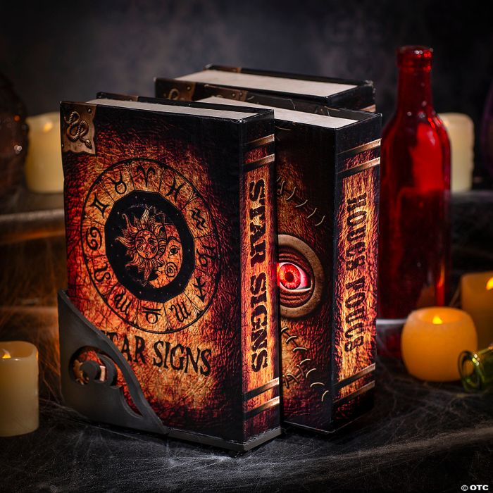 Frightfully fun moments await on your night of terror when you add this delightfully spooky animated book set decoration to your haunted house or Halloween party. This decoration features three books titled “Star Signs”, “Hocus Pocus” and “Spells” and is covered with cryptic symbols and a human skin design. Once activated, the middle book appears to move on its own to reveal a terrifying eye that is sure to creep out anyone who dares wander close. Requires batteries