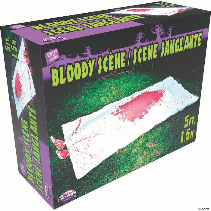 Create a spine-chilling display with our Complete Bloody Scene Kit! Looks like a dead body covered with a bloody sheet after a gruesome death. You get one 3.5'x 6' bloody-looking polyester knit sheet with 4 grommets, 2 realistic-looking PVC feet, a 59" inflatable PVC body, and 4 plastic yard stakes. Just set it up in your Halloween setting and wait for the screams to begin!