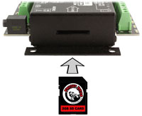 The Flex can use either it’s internal memory or an SD card for animation and audio storage. The internal 4MB flash chip has enough memory for most props. For more demanding props, pop in an SD card and it’ll use that instead.