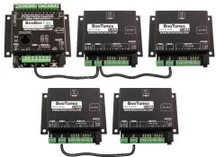 BooTunes and BooBoxes can be easily chained together using DMX to have them trigger the same scenes simultaneously. Using the DMX connection means you don't have to waste the BooBox's outputs to trigger additional audio channels.