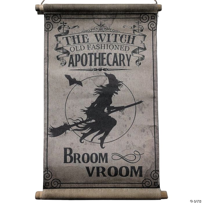 Our vintage canvas sign invites you to enter The Witch Old-Fashioned Apothecary for all your potion ingredient needs! Aged-looking canvas sign with hanging cord advertises the popular Broom Vroom! A pole at the top and bottom keep the sign straight and even. Measures 17.5” x 1” x 26.4”; 0.44 lbs. Made of Canvas 70%; Wood 25%; Hemp Rope 5%.