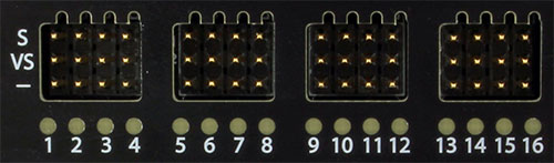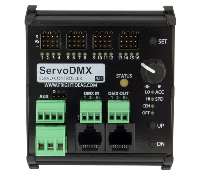 The ServoDMX can control up to 16 RC servos depending on the model you purchase. The circuit board has been carefully designed to deliver high current to each servo so they can deliver as much torque as possible.