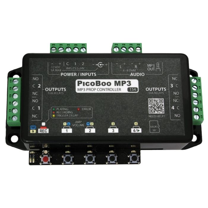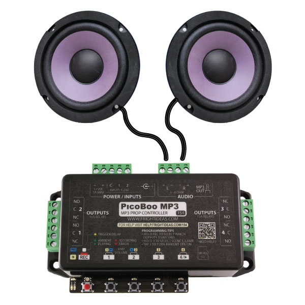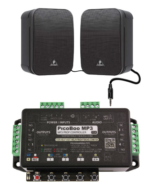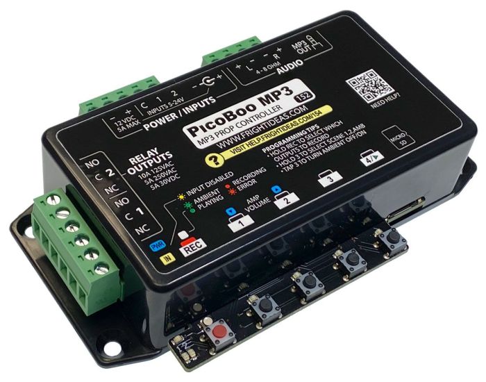 The PicoBoo MP3 uses the same MP3 decoder as our BooBoxes. No need to play sounds into these PicoBoos, just copy the files to a MicroSD card. An unlimited number of scare sounds can be used to mix things up.