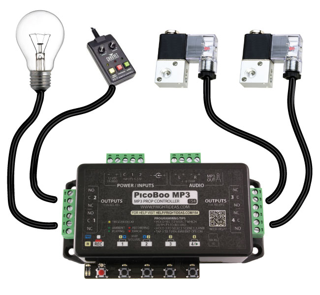 The PicoBoo MP3 doesn’t just play sounds during ambient mode, it can also animate the outputs while the prop is waiting to be triggered. Program this mode with what you want the patrons to see and hear as they approach the scare - a little foreshadowing of the terror to come.