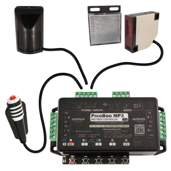 The PicoBoo MP3 has two trigger inputs. The second input can be used to trigger an alternate scene, or as a stop or reset button. Both inputs can be set to single-shot mode, which prevents looping if the trigger is kept on. This is handy if a beam sensor goes out of alignment. They can also be set to a Run Once mode. This makes sure they can only run their scene once until the other input is triggered. This is really handy for Escape Rooms that want the scene to run only once until a reset button is pressed.