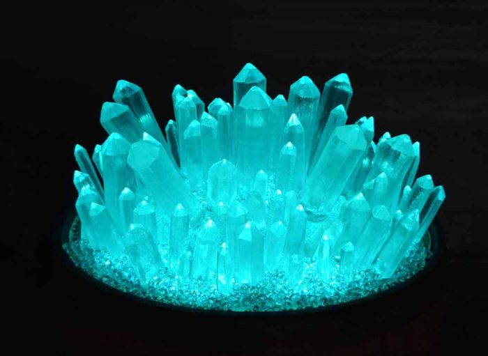 It features a large cluster of clear crystals that can be lit from below in any color. Sized for a standard whiskey barrel.