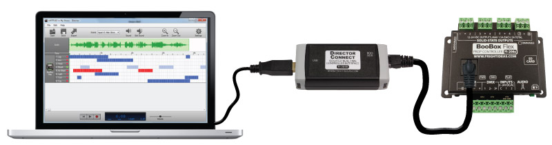 The Director Connect is designed to work seamlessly with our free Director software. You can click play and immediately see your scene changes come to life in the real world. Without the Director Connect you have to export the show to an SD card and insert it into the controller each time you want to see how the changes look on the actual prop or set.