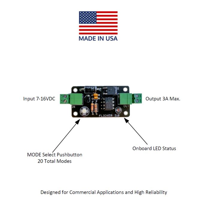 A single pushbutton allows the user to cycle through a wide array of output light patterns including ember, candle, and flame flicker modes, flashing and strobe effects, as well as simulated neon and electrical fixture flicker. Steady state brightness modes are also available. Internal memory allows the device to resume the previously selected output mode in the event power is loss to the device. This is also useful for permanent installations where a single operating mode is required continuously.