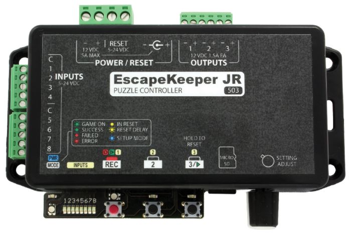 The EscapeKeeper is available in two models. The EscapeKeeper has audio capability, the EscapeKeeper JR does not. Each model has multiple puzzle modes you can choose from. Simply choose your puzzle mode, connect up to eight inputs, tap record, then act out your puzzle's solution. That's it! When the players figure out how to repeat those same actions the EscapeKeeper will unlock the door or activate a device of your choosing.