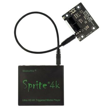 Looping play begins when power is applied. It plays most high definition file types including mpeg, H.264 and WMV9 from a SD memory card or USB drive. It can be used as an audio repeater playing MP3 or WAV files. It has a 2-way serial communications port at 3v3 or 5v TTL level to work with external control devices to play multiple files on command. The Sprite gives feedback reports every half second telling the file playing, and also reports the end of file mark. It has a single direct push-button input that can trigger on contacts or High or Low level change. There is no black space when looping or changing files. It has a 5V DC output to power a motion sensor or other small load.