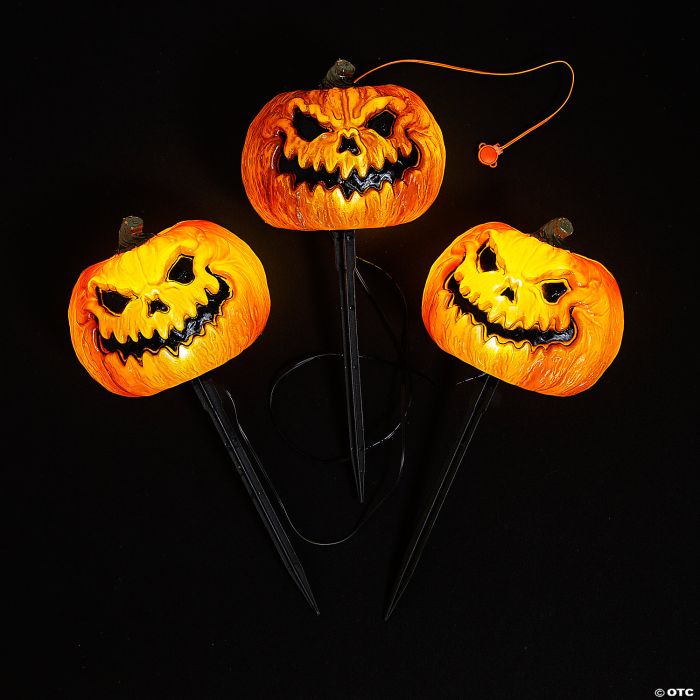 Perfect for adding that final touch to your home haunt these pathway markers will light the way to even more scares! 3 wonderfully sculpted plastic pumpkins that are sound and motion activated with four sayings/sounds and light that flash in rhythm to tho