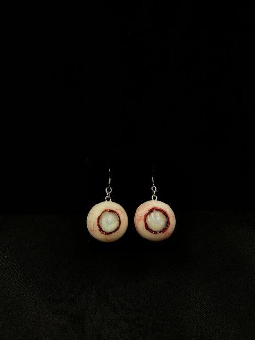 Our Eyeball earrings are made out of Siltec and adorned with realistic blood.