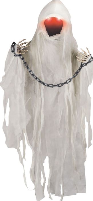 If you're ready to bring home the best haunted buddy you've ever seen, this Hanging Faceless Ghost decoration is just the thing. This constructed spirit's wire-frame structure is covered in layers of off-white mesh fabric that gives it a truly haunted look. The vacant space at the head gives it the look of a faceless shadow in dim lighting and its skeletal hands hold chains and a light-up lantern.