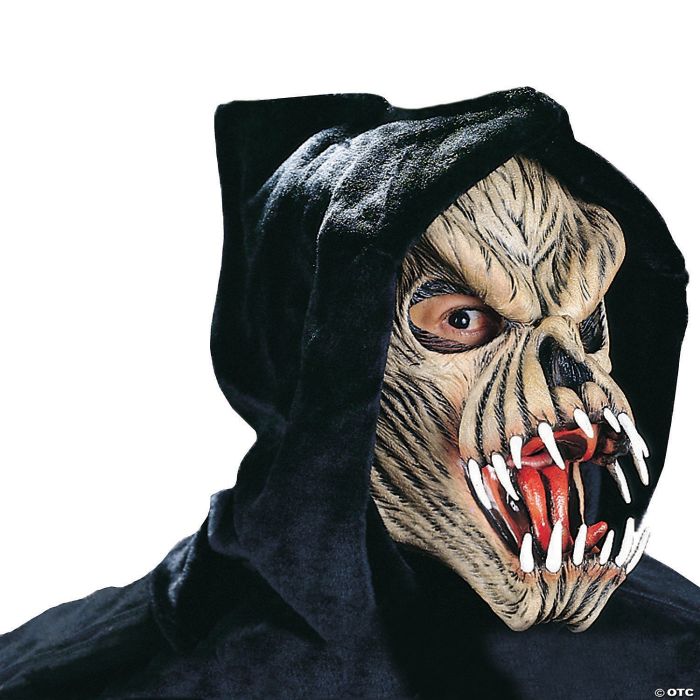 Latex rubber face mask with attached fabric hood. Elastic straps provide a comfortable secure fit.