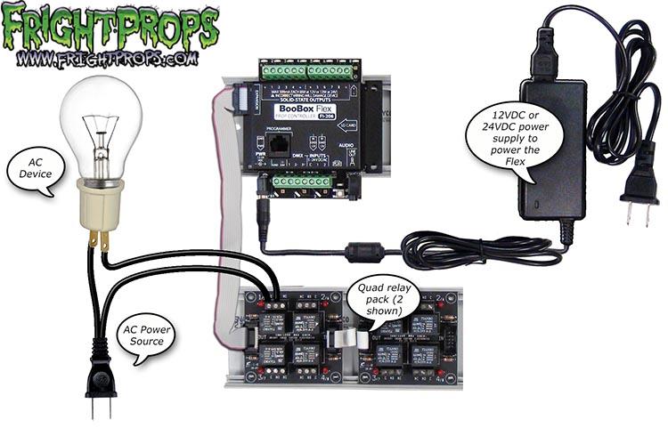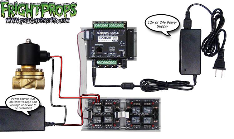 This diagram shows how to use a relay and also how to share a single 12V 5A power supply to power the BooBox and also fire off a device (a solenoid is shown but this could be any 12V device). Â The single power supply must output enough wattage to power the Flex and also the device you will be activating.Â