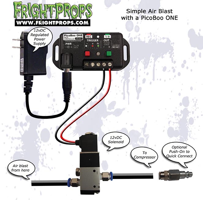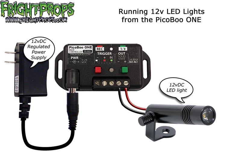 The PicoBoo ONE's output can handle up to 2 amps. It's solid-state, so it outputs either 12 or 24 volts depending on what power supply you use to power it. The output can be set to mimick a normally-closed contact, turning it off instead of on when activated - great for darkening a room when patrons enter. This output cannot be used to control high-voltage AC devices unless a relay is used.