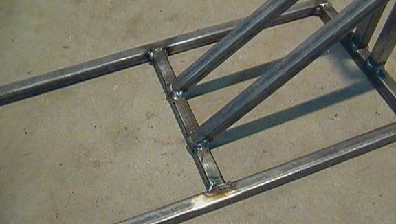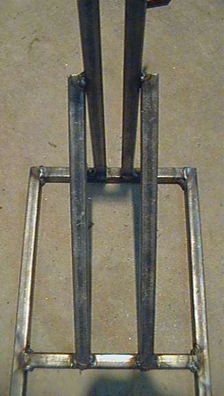 Cut two pieces about 10inches long from stock of 1/2tubing. Cut the tips off of them so that the ends have a 45degree angle. Afterwards, weld these pieces from the top of the crossbar in the U-piece (45degree edge down) to the outer sides of the two vertically pointing rods.