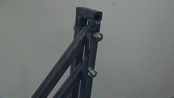 Once these pieces are welded on, double check that a 1/2inch piece and two washers will still fit between the pieces (make sure that it’s loose enough for the washers to spin in them, the rig arm will go here). When you have, weld a 3/2inch piece of 1/2inch steel over the top of the pieces, to brace them against each other.