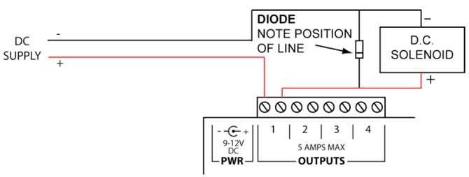Solenoids and Large Relays create a lot of interference, this can wreak havoc to nearby electronic devices. If you notice the sound is stopping unexpectedly when controlling one of these devices, this is most likely your problem. The solution depends on whether you are using AC or DC solenoids. For AC solenoids you need touse a capacitor, the best place to install it is as close as possible to the solenoid, if that’s not possible thenacross the terminal block may work as well. For DC solenoids you need to use a diode, standard 1N400Xdiodes will work fine, the only place to install these is across the solenoid. See the diagrams below for more information.