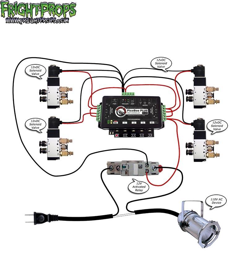 PicoBoo PLUS with four 12V solenoids and a 12V relay sharing an output TO POWER A 110V DEVICE