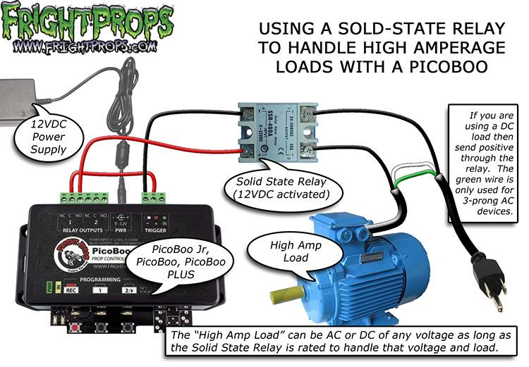 The BooBox, PicoBoo controllers, Wireless Trigger, and other similar devices with relays are designed to switch on devices that are rated less than 10 amps. Â If you need to control a device that is greater than 10 amps you will need to use a relay that can handle the load. We recommend a solid state type relay. This document shows you how to use these.