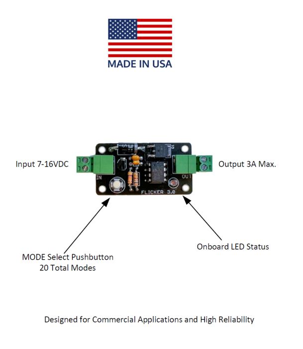 A single pushbutton allows the user to cycle through a wide array of output light patterns including ember, candle, and flame flicker modes, flashing and strobe effects, as well as simulated neon and electrical fixture flicker. Steady state brightness modes are also available. Internal memory allows the device to resume the previously selected output mode in the event power is loss to the device. This is also useful for permanent installations where a single operating mode is required continuously.
