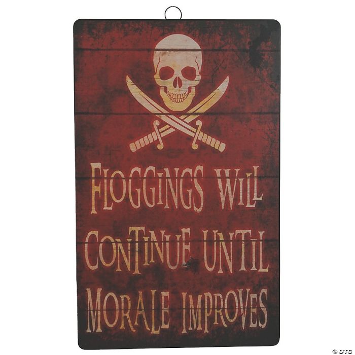 Add a touch of macabre humor with this fun Metal Sign with the saying, FLOGGINGS WILL CONTINUE UNTIL MORALE IMPROVES! The rusty spots and dents add to the desired effect and the Skull & Crossbones at the top definitely add a pirate flair! Painted to