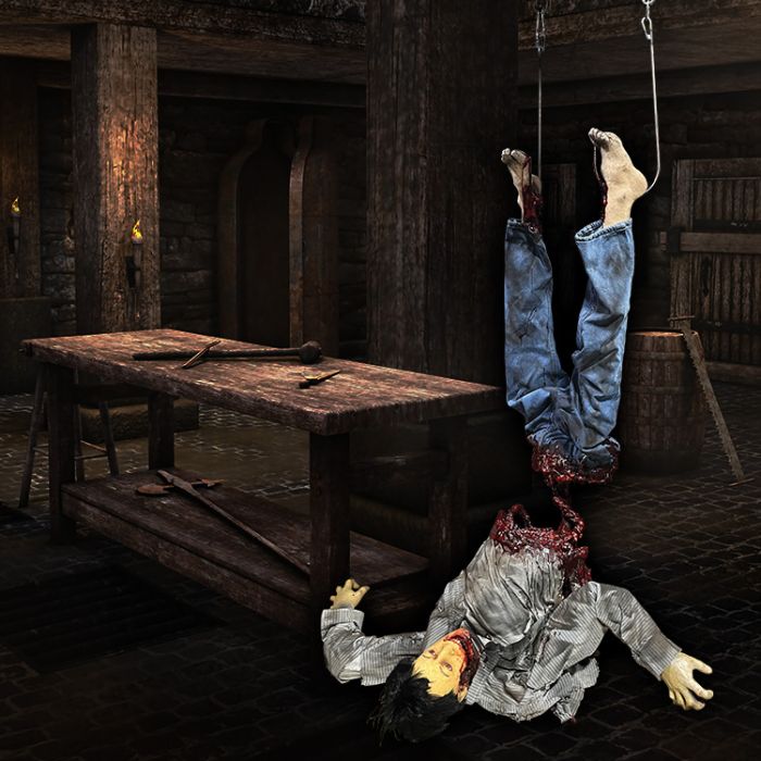 Split in half victim with guts connecting legs to torso hangs from hooks through his ankles, then twitches and screams!