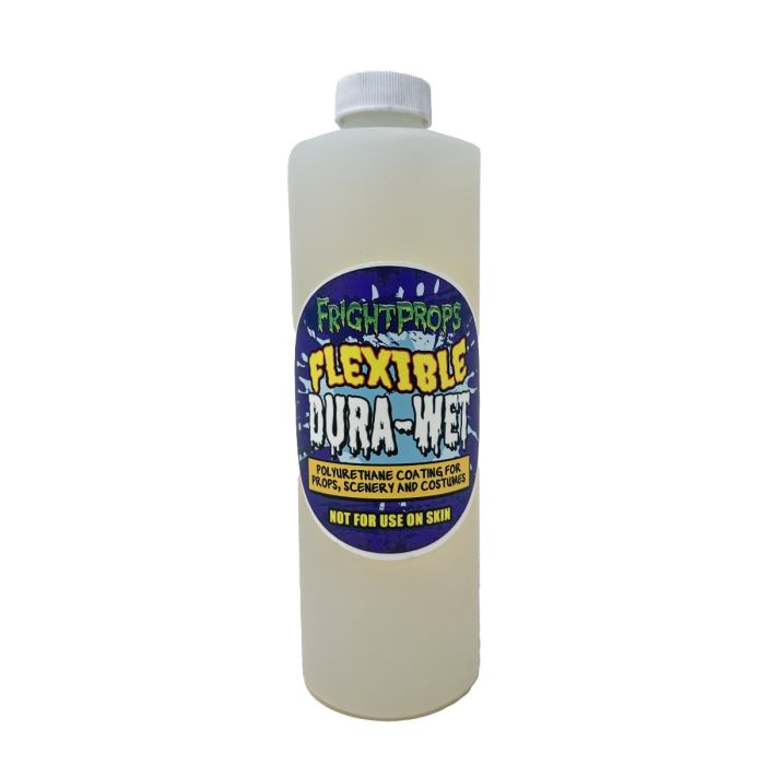 This water based polyurethane coating can be used as a stretch coating for most plastics, synthetic rubber, latex, flexible polyurethane foams, and polyurethane elastomers. When brushed or sprayed, FrightProps Flexible Dura-Wet will air dry quickly to form a soft, stretchy elastomeric coating. This product is not for use on live humans or animals.