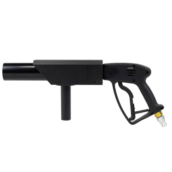 The aluminum body & barrel components are custom fabricated with extreme precision and will not corrode like traditional steel parts. The integrated silencer reduces output noise by up to 30dB, making it significantly quieter than other products on the market. The custom ventilation design will prevent the product from creating dry ice particles. The Handheld CO2 Cannon comes standard with an integrated stability handle, improving control and maneuverability, while adding a sleek look.