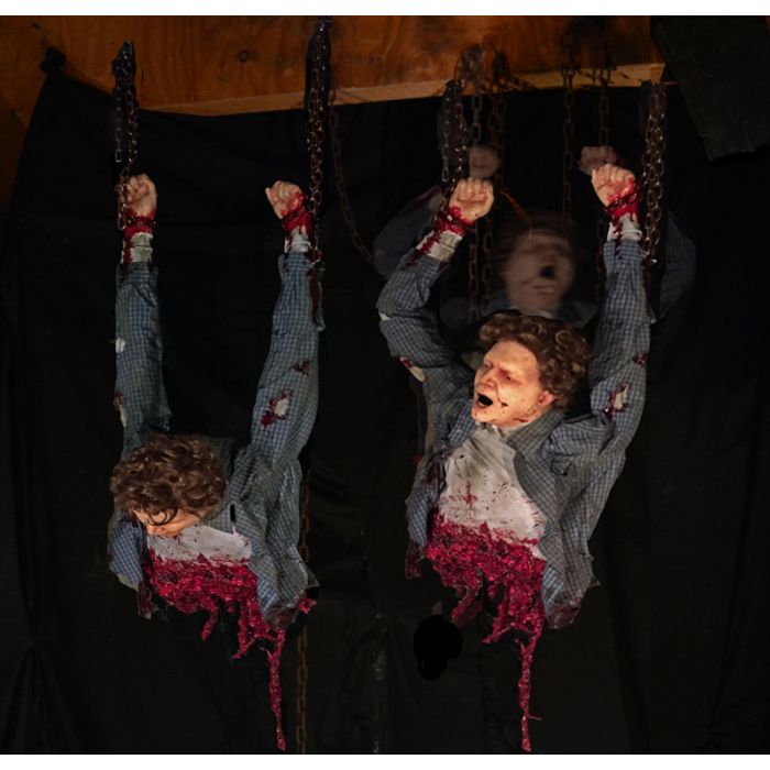 This is the non-animated version of our popular Hanging Meat prop. Half Torso hangs from chains wrapped around wrist. Comes with Character, Chains.
