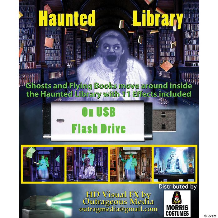 Haunted Library DVD. Ghosts Float around a number of Library rooms, large and small, while a girl studies in the foreground. Perfect for a wizard school type scene. 11 effects are included, with a Ghost putting ghost books on a shelf, a possessed girl horror ghost, and wizard girls doing a variety of spooky spells. Video FX for Halloween! No license required for Commercial Attractions. Hang a white screen in a window and using a projector you can project video onto your screen for a very realistic illusion. You can also show these on your television!.