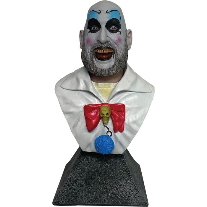 The Officially Licensed Captain Spaulding Mini Bust from the cult classic horror movie House of 1000 Corpses. Each immaculately painted resin Bust is detailed to perfection. The piece is featured in a graphic display box with clear vinyl window to highlight its unique and stunning design. Out of the box it stands approximately 5 inches tall including a base that makes for easy placement around your home or office. This highly collectible beauty is sure to turn heads wherever you place it and is durable enough to enjoy for years.