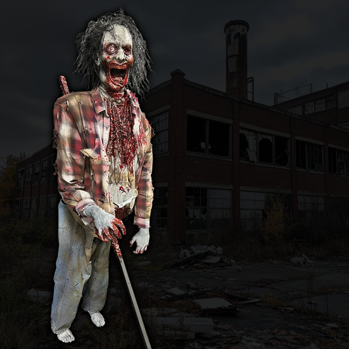 Plug & Play! All of our pneumatic (air powered) props come complete and ready to run with programmed controller, motion sensor, intense audio, and speakers. Foot print for rig is 48" d x 23" w x 63" h.